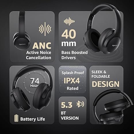 Amazon Basics Pro Series Wireless Noise Cancelling ANC Over Ear Headphone | Bluetooth Headset | USB Charging | 10 m Paring Distance | 74 Hours Battery Life | 40 mm Drivers | IPX4 Rated (Black)