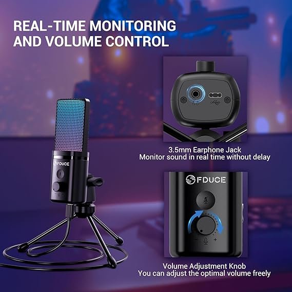 FDUCE M160 Gaming USB Microphone,RGB Condenser Microphone with Tripod,Volume Adjustment and Mute Button Function,Compatible with PC,Laptop,for Gaming,Podcasting,Streaming,YouTube
