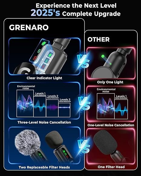 • [ Experience the 2025 Upgrade with 3 Exciting Enhancements ] – â‘  Brighter, clearer LED indicators for easier mode selection.â‘¡ Customizable 3-level noise reduction to suit every environment.â‘¢ Effortlessly switch between the sponge filter head and windproof plush filter head for optimal sound in any setting—perfect for mic for YouTube wireless and wireless mic for YouTubers.