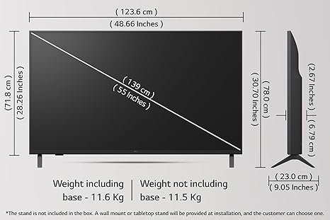• Additional information: Brand Warranty can be availed using amazon invoice and User manual can be accessed from brand website | Included Components: 1 UHD TV, 1 Remote with 2AAA Batteries (Note: LG does not include a TV stand inside the box. A free wall mount or table-top stand will be provided and installed by LG’s technician during installation. Customers can choose one option at the time of service.)